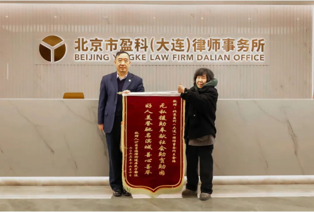 “无私援助奉献社会助贫助困 好人美誉驰名滨城善心善举”——盈科大连律师获锦旗